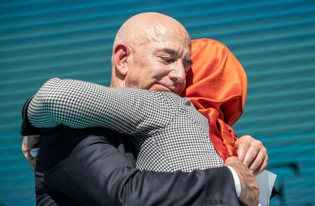 What’s baffling is that Bezos really was a tech visionary, and, in fact, so many of that first generation or two of tech bros were. Google’s Sergey Brin and Larry Page transformed forever the way we tap into the riches of the world’s information and learning. Elon Musk made environmentally-friendly electric cars that were fast and beautiful and promised us that his rockets would take us to Mars. Even Travis Kalanick, the rapacious CEO and co-inventor of Uber, invented a way for us to never be stranded. But as all the nerdy dreamers bulked up into heedless plutocrats, it was like watching a chart of the Descent of Man—their muscles bulged to comic-book proportions, their aspirations coarsened, they hid out in their luxury, blue zone caves. I think most of them had set out with a genuine belief that tech could make the world a better place, but they wound up instead wanting just to better their OWN place.