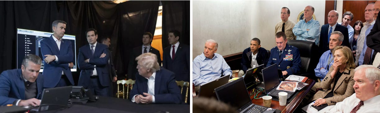 Trump has always seethed with jealousy over Obama’s iconic Osama bin Laden operation, authorized the very night in 2011 that the 44th president was humiliating Trump with his birther roast at the White House Correspondents’ Dinner before a room full of laughing liberals. On Saturday, photographs were released of the makeshift Venezuela war room at Mar-a-Lago, showing Trump, Hegseth, Rubio, Miller, and co. perched on gilded ballroom chairs or hovering before screens behind a hastily set up pipe and drape. It was an ersatz version of the famous bin Laden war room photo that captured the awe and incredulity of that historic moment.